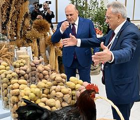 XXV Российская агропромышленная выставка "Золотая осень 2023" в Российском государственном аграрном университете (РГАУ-МСХА) имени К.А.Тимирязева. Председатель правительства России Михаил Мишустин (слева) и министр сельского хозяйства России Дмитрий Патрушев (справа) на выставке.
