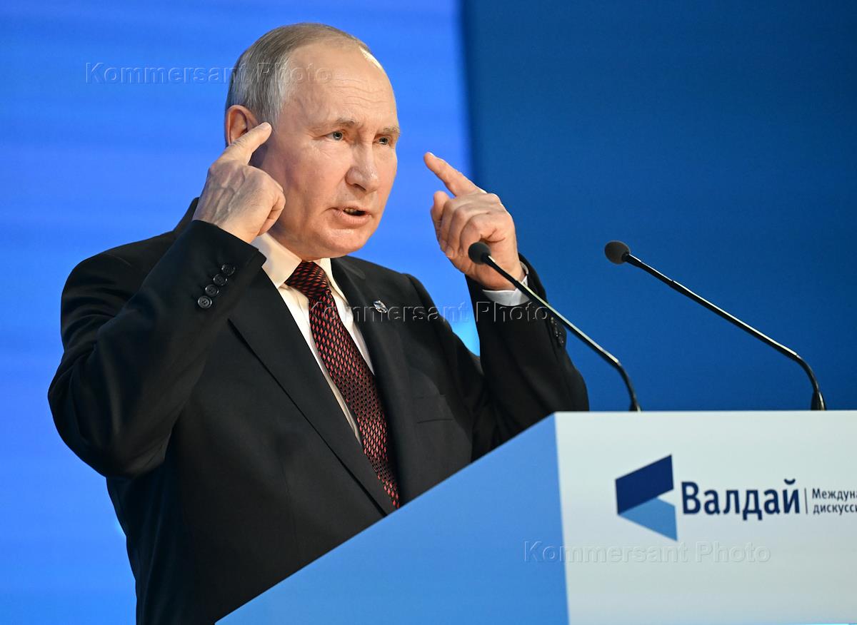Рабочая поездка президента России Владимира Путина в Сочи. Пленарная сессия XX ежегодного заседания Международного дискуссионного клуба "Валдай" "Справедливая многополярность: как обеспечить безопасность и развитие для всех". Президент России Владимир Путин во время выступления на заседании.