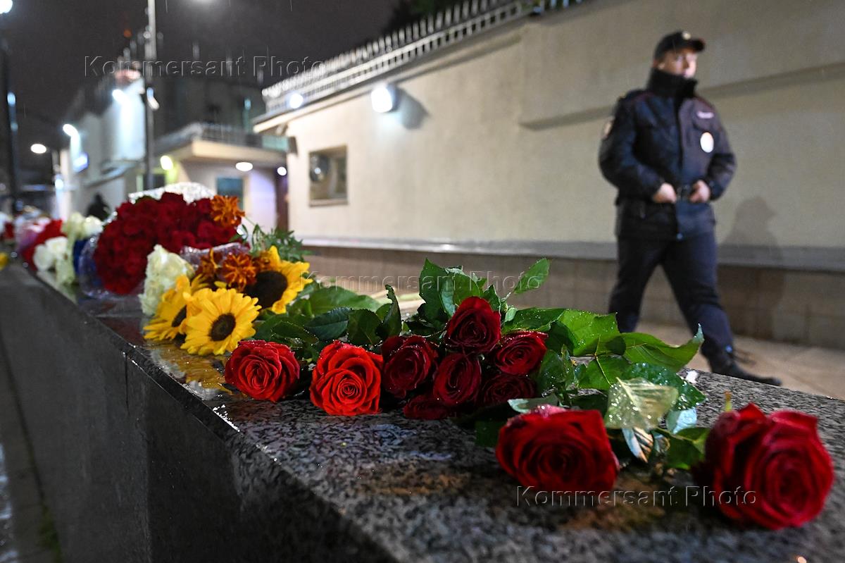 Цветы у здания посольства Израиля в Москве в память о жертвах атаки движения "Хамас" на Израиль.