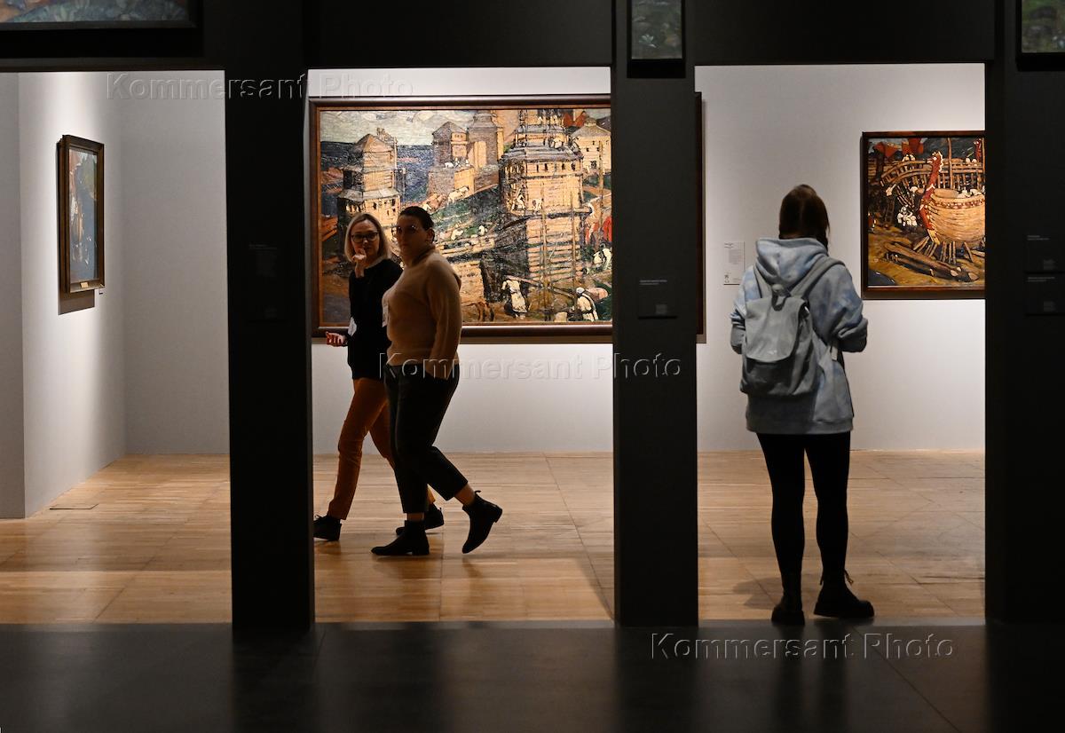 Выставка "Николай Рерих" в Государственной Третьяковской галерее на Крымском валу. Посетители на выставке.