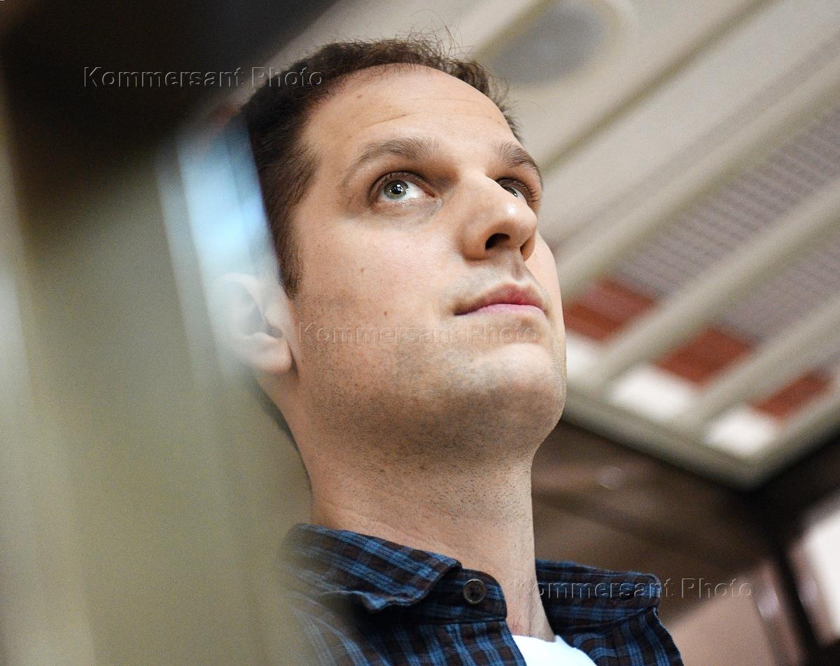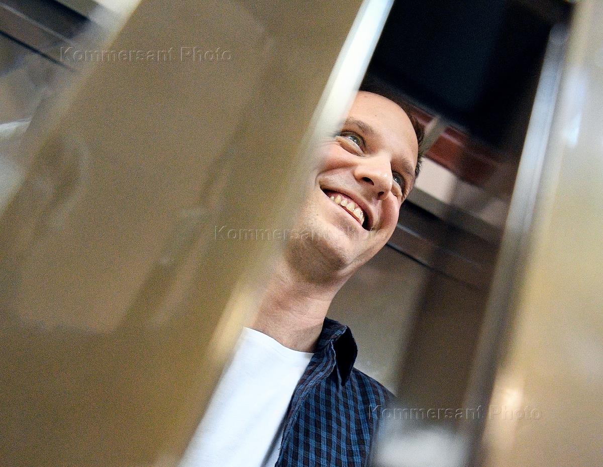 Корреспондент московского бюро издания The Wall Street Journal Эван Гершкович, обвиняемый в шпионаже, во время заседания Московского городского суда.