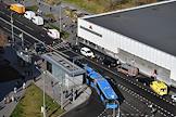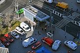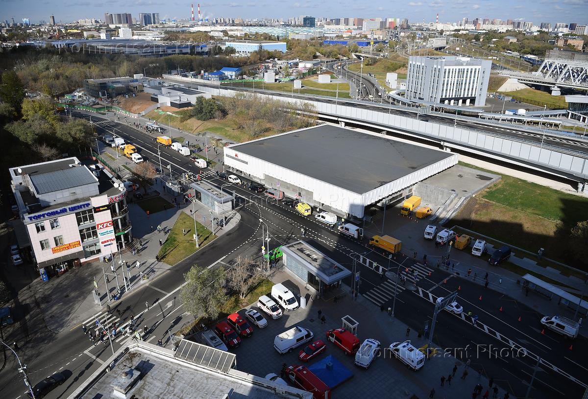 Столкновение двух поездов на станции "Печатники" Люблинско-Дмитровской линии Московского метрополитена. Ситуация у станции метро "Печатники". Автомобили спасательных служб у входа на станцию метро.