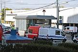 Столкновение двух поездов на станции "Печатники" Люблинско-Дмитровской линии Московского метрополитена. Автомобили спасательных служб у входа на станцию метро "Печатники".