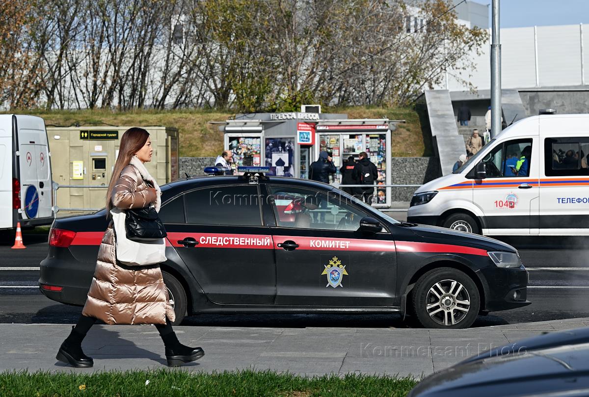 Столкновение двух поездов на станции "Печатники" Люблинско-Дмитровской линии Московского метрополитена. Ситуация у станции метро "Печатники". Автомобиль следственного комитета России у входа на станцию метро.