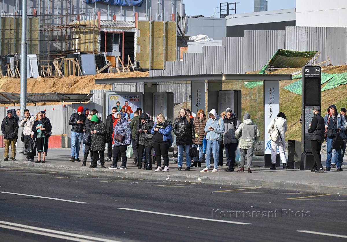 Столкновение двух поездов на станции "Печатники" Люблинско-Дмитровской линии Московского метрополитена. Ситуация у станции метро "Печатники". Пассажиры на остановке наземного общественного транспорта.