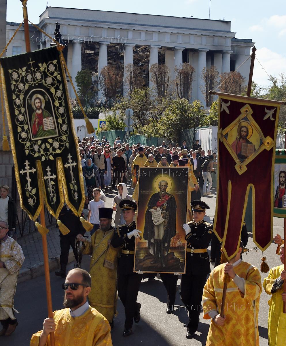 Крестный ход с чудотворной иконой святого праведного воина Федора Ушакова, уцелевшей при атаке на штаб Черноморского флота, прошел в Севастополе. Командующий Черноморским флотом, адмирал Виктор Соколов (в центре), губернатор Севастополя Михаил Развожаев и помощник благочинного Севастопольского округа протоиерей Стефан Сломчинский во время крестного хода.