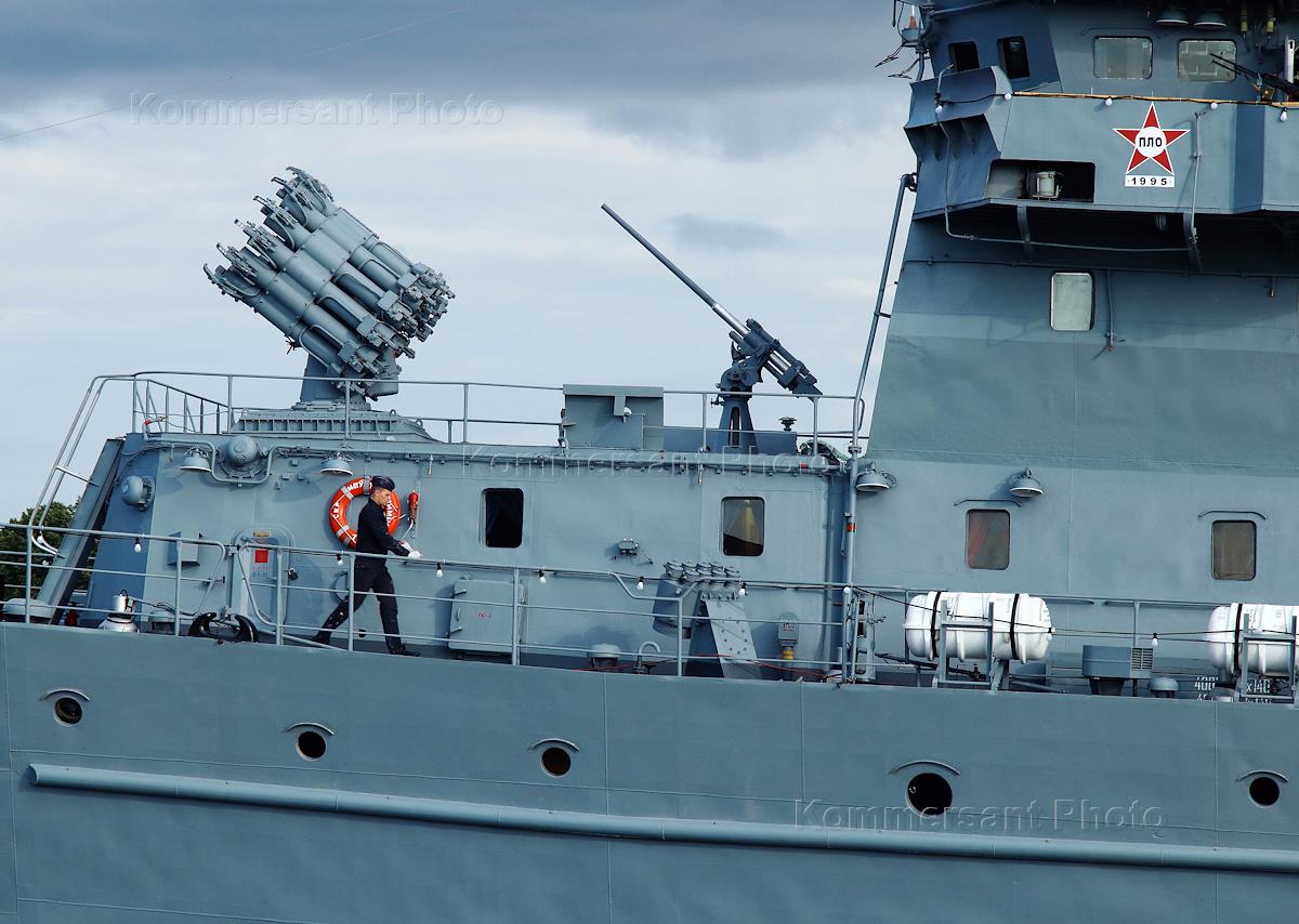 Жанровая фотография. Матрос идет по палубе сторожевого корабля "Неустрашимый", пришвартованного у Университетской набережной перед началом проведения Военно-Морского парада.