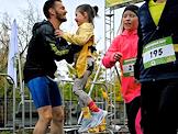 Фестиваль инклюзии в спорте, организованный благотворительным фондом "Больше Чем Можешь" на территории выставочного комплекса ВДНХ. Жанровая фотография. Папа с дочкой на финише забега.