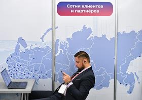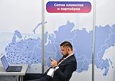 XXVII Международная выставка средств безопасности государства "Интерполитех – 2023" в павильон № 57 ВДНХ. Жанровая фотография. Участник выставке у плаката с изображением карты России и надписью "Сотни клиентов и партнеров".