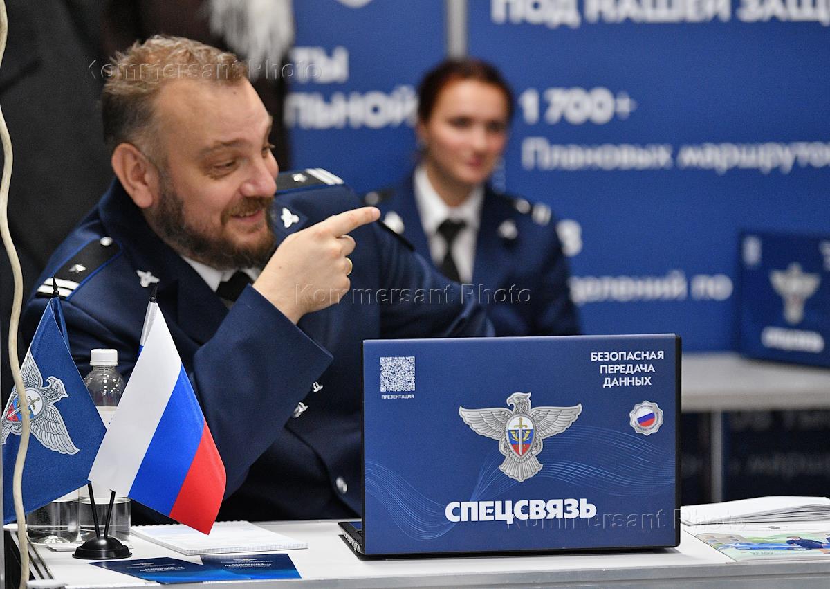 XXVII Международная выставка средств безопасности государства "Интерполитех – 2023" в павильон № 57 ВДНХ. Стенд структурного подразделения ФСО России "Спецсвязь". Жанровая фотография. Надпись на ноутбуке "Безопасная передача данных".