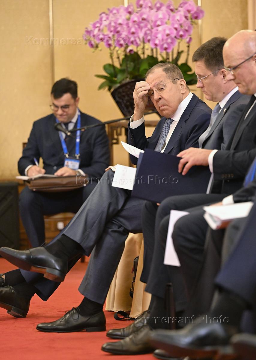 Рабочая поездка президента России Владимира Путина в Китай. Форум "Один пояс - один путь". Встреча президента России Владимира Путина и премьер-министра Таиланда Сеттха Тхависин в резиденции "Дяоюйтай". Министр иностранных дел России Сергей Лавров (слева) во время встречи.