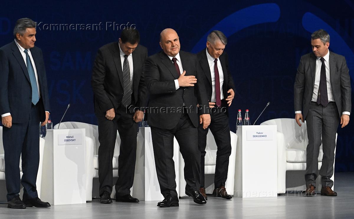 Международный экспортный форум "Сделано в России" в Центральном выставочном зале "Манеж". Председатель правительства России Михаил Мишустин (в центре) на пленарной сессии форума "Точки опоры новой архитектуры внешнеэкономической деятельности".