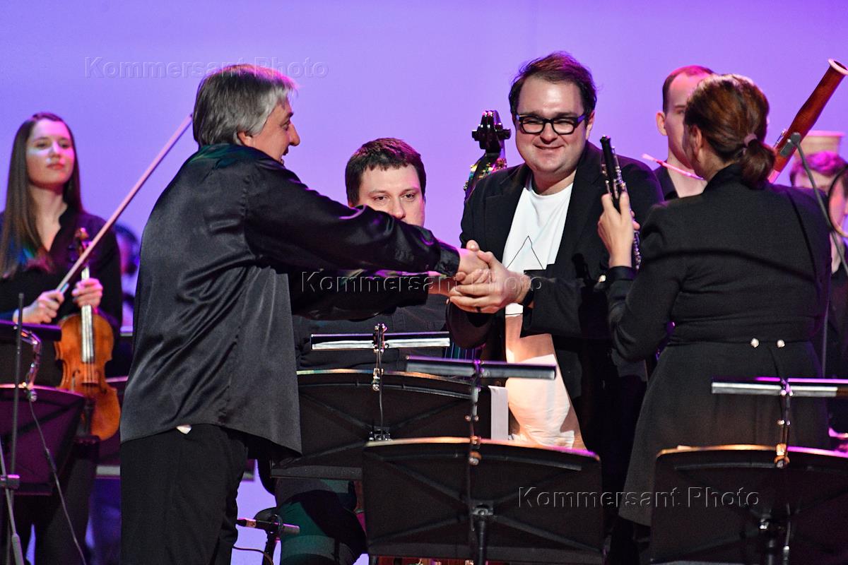 Концерт ансамбля солистов "Студия новой музыки" "Другое пространство. Continuo" в Концертном зале имени П.И.Чайковского. Дирижер Игорь Дронов (в центре) и чтец Никола Дориа (слева) во время концерта.
