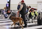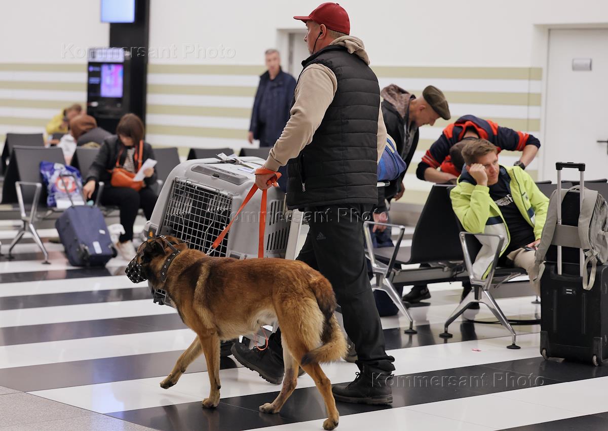 Международный аэропорт Шереметьево имени А.С.Пушкина. Жанровая фотография. Пассажир с собакой в зоне выдачи багажа.