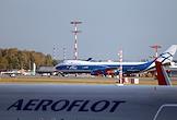 Международный аэропорт Шереметьево имени А.С.Пушкина. Жанровая фотография. Самолет авиакомпании "Аэрофлот" на взлете.