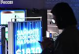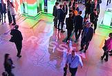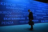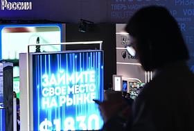 Международный экспортный форум "Сделано в России" в Центральном выставочном зале "Манеж". Жанровая фотография. Электронное табло с надписью "Займите свое место на рынке" на выставке форума.