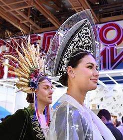 Международный экспортный форум "Сделано в России" в ЦВЗ "Манеж". Жанровая фотография. Участницы форума в национальных костюмах.