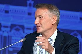 Международный экспортный форум "Сделано в России" в ЦВЗ "Манеж". Пленарная сессия "Единороги на рынках будущего". Президент, председатель правления Сбербанка России Герман Греф во время заседания сессии.