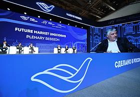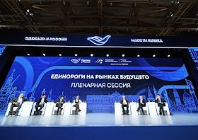 Международный экспортный форум "Сделано в России" в ЦВЗ "Манеж". Пленарная сессия "Единороги на рынках будущего". Участники во время заседания сессии.