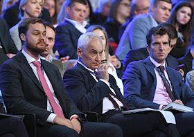 Международный экспортный форум "Сделано в России" в ЦВЗ "Манеж". Пленарная сессия "Единороги на рынках будущего". Первый заместитель председателя правительства России Андрей Белоусов (в центре) во время заседания сессии.