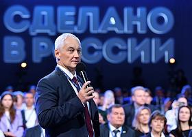 Международный экспортный форум "Сделано в России" в ЦВЗ "Манеж". Пленарная сессия "Единороги на рынках будущего". Первый заместитель председателя правительства России Андрей Белоусов во время заседания сессии.