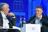 Международный экспортный форум "Сделано в России" в ЦВЗ "Манеж". Пленарная сессия "Единороги на рынках будущего". Президент, председатель правления Сбербанка России Герман Греф (справа) во время заседания сессии.