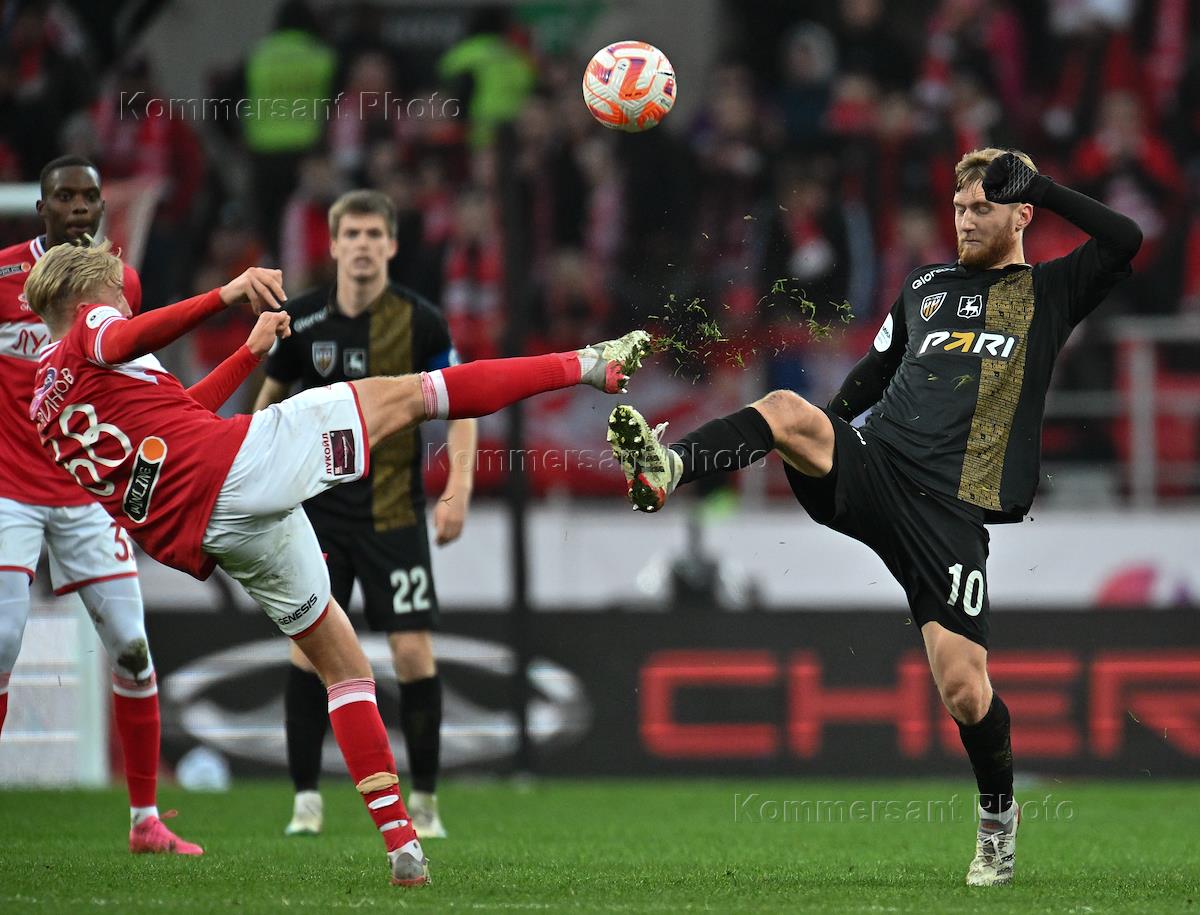 Российская Премьер-Лига (РПЛ). МИР - Чемпионат России по футболу 2023/2024. 12-й тур. Матч между командами "Спартак" (Москва) - "Пари Нижний Новгород" (Нижний Новгород) на стадионе "Открытие Банк Арена". Игрок команды "Пари Нижний Новгород" Александр Трошечкин (справа) и игрок команды "Спартак" Руслан Литвинов (слева) во время матча.