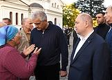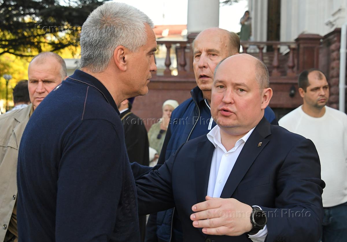 Церемония встречи нового главы митрополии Крыма Тихона. Глава Республики Крым Сергей Аксенов (слева) и губернатор Севастополя Михаил Развожаев (справа) после окончания благодарственного молебна новоназначенного Главы Крымской митрополии Высокопреосвященнейшего митрополита Симферопольского и Крымского Тихона в Александро-Невском кафедральном соборе.