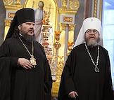 Церемония встречи нового главы митрополии Крыма Тихона. Новоназначенный Глава Крымской митрополии Высокопреосвященнейший митрополит Симферопольский и Крымский Тихон (справа) во время благодарственного молебна в Александро-Невском кафедральном соборе.