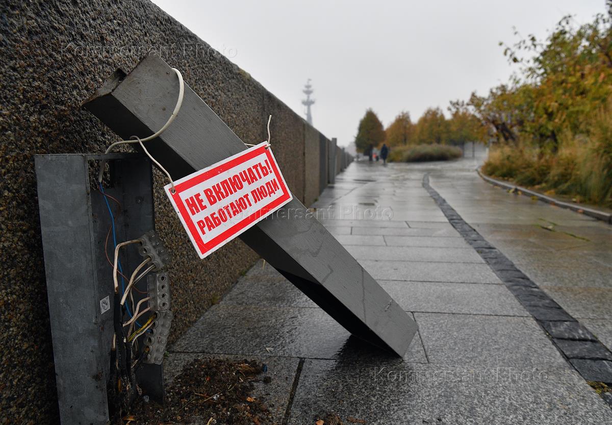 Виды Москвы. Жанровая фотография. Табличка "Не включать! Работают люди" на сломанном столбе.