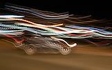 Виды Омска. Жанровая фотография. Автомобиль движется на фоне вечерних огней по городу.