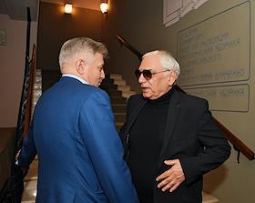 Праздничный вечер, посвященный 125-летнему юбилею Московского Художественного театра. Премьера спектакля "9 ряд. 10, 11 место" режиссера Дениса Азарова по пьесе Юлии Поспеловой на сцене МХТ имени А.П.Чехова. Руководитель рабочей группы по координации подготовки и проведения информационно-пропагандистских мероприятий в связи с памятными датами военной истории Отечества Российского организационного комитета "Победа" Александр Кибовский (слева) и генеральный директор киноконцерна "Мосфильм", режиссер Карен Шахназаров (справа) после спектакля.