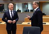 Саммит Европейского союза (ЕС) в Брюсселе. Канцлер Германии Олаф Шольц (слева) и премьер-министр Финляндии Петтери Орпо (справа) на саммите.
