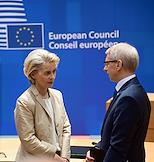 Саммит Европейского союза (ЕС) в Брюсселе. Глава Еврокомиссии Урсула фон дер Ляйен (слева) и премьер-министр Болгарии Николай Денков (справа) на саммите.