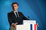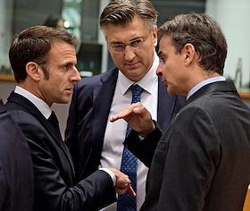 Саммит Европейского союза (ЕС) в Брюсселе. Слева направо: президент Франции Эммануэль Макрон, премьер-министр Хорватии Андрей Пленкович и премьер-министр Греции Кириаков Мицотакис во время саммита.