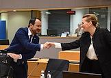 Саммит Европейского союза (ЕС) в Брюсселе. Президент Кипра Никос Христодулидис (слева) и премьер-министр Дании Метте Фредериксен (справа) на саммите.