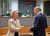 Саммит Европейского союза (ЕС) в Брюсселе. Глава Еврокомиссии Урсула фон дер Ляйен (слева) и канцлер Германии Олаф Шольц (справа) на саммите.