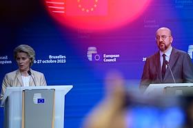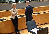 Саммит Европейского союза (ЕС) в Брюсселе. Глава Еврокомиссии Урсула фон дер Ляйен (слева) и председатель европейского совета Шарль Мишель (справа) на саммите.