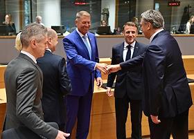 Саммит Европейского союза (ЕС) в Брюсселе. Слева направо: глава Еврокомиссии Урсула фон дер Ляйен, канцлер Германии Олаф Шольц и премьер-министр Болгарии Николай Денков на саммите.