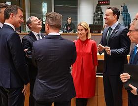 Саммит Европейского союза (ЕС) в Брюсселе. Премьер-министр Ирландии Лео Варадкар (справа) и премьер-министр Эстонии Кая Каллас (слева) во время саммита.