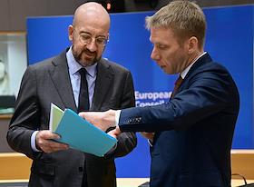 Саммит Европейского союза (ЕС) в Брюсселе. Председатель Европейского совета Шарль Мишель (слева) во время саммита.