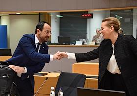Саммит Европейского союза (ЕС) в Брюсселе. Президент Кипра Никос Христодулидис (слева) и премьер-министр Дании Метте Фредериксен (справа) на саммите.