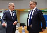 Саммит Европейского союза (ЕС) в Брюсселе. Канцлер Германии Олаф Шольц (слева) и премьер-министр Финляндии Петтери Орпо (справа) на саммите.