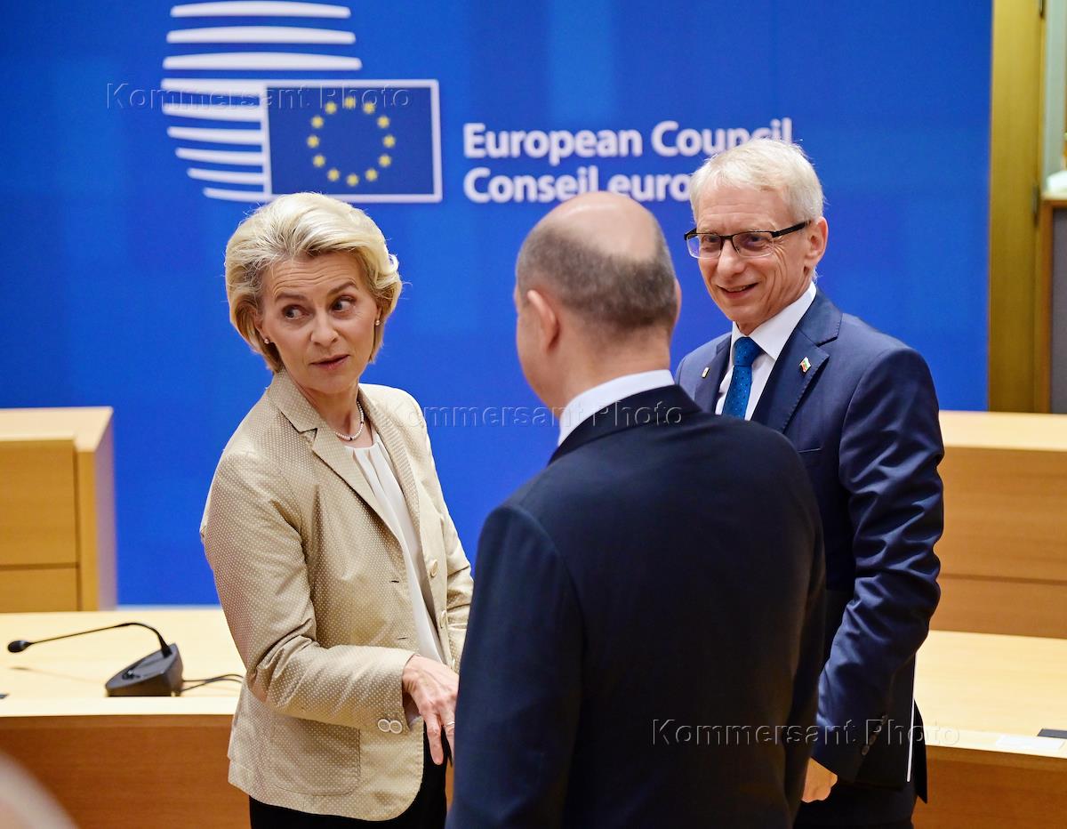 Саммит Европейского союза (ЕС) в Брюсселе. Глава Еврокомиссии Урсула фон дер Ляйен (слева) и канцлер Германии Олаф Шольц (справа) на саммите.