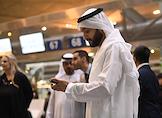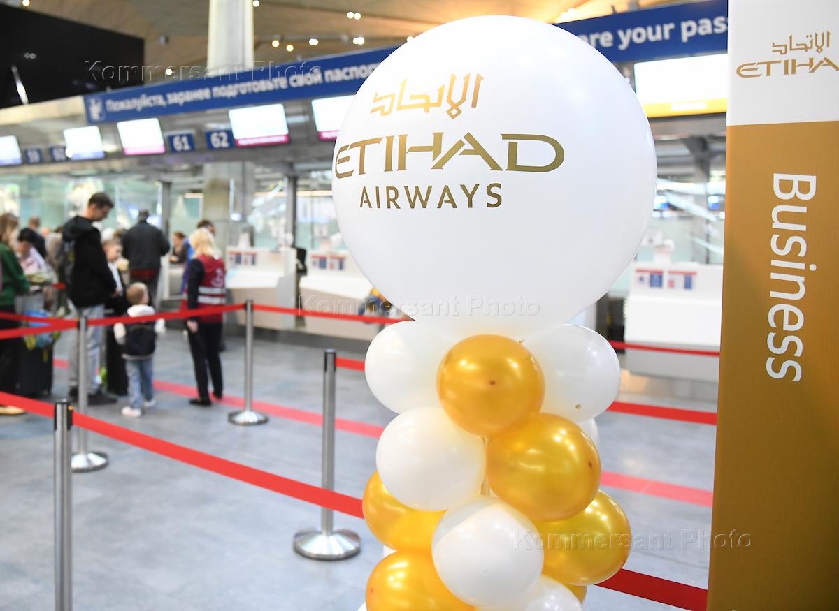 Торжественная церемония запуска самолета, совершающего первый рейс авиакомпании Etihad в Абу-Даби из аэропорта Пулково в Санкт-Петербурге. Пассажиры в аэропорту.