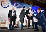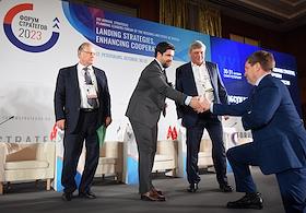 XXI Общероссийский форум "Стратегическое планирование в регионах и городах России" в отеле "Коринтия Санкт-Петербург". Слева направо: глава города Тобольска Максим Афанасьев, первый заместитель генерального директора "Группы ЛСР" Игорь Левит и заместитель председателя ПАО "Промсвязьбанк" Антон Дроздов во время форума.