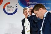 XXI Общероссийский форум "Стратегическое планирование в регионах и городах России" в отеле "Коринтия Санкт-Петербург". Председатель комитета по экономической политике и стратегическому планированию Санкт-Петербурга Алексей Зырянов (слева) и исполняющий обязанности генерального директора АО "Корпорация развития Санкт-Петербурга" Денис Горнев (в центре) во время форума.