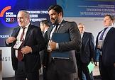 XXI Общероссийский форум "Стратегическое планирование в регионах и городах России" в отеле "Коринтия Санкт-Петербург". Заместитель председателя Государственной думы России Сергей Неверов (слева) и председатель Санкт-Петербургского регионального отделения Общероссийской общественной организации "Деловая Россия" Дмитрий Панов (второй слева) во время форума.