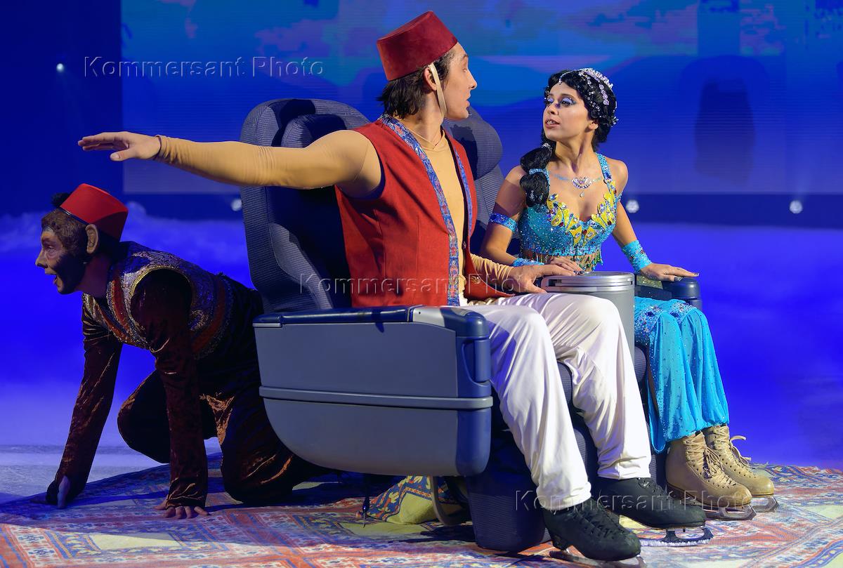 Ледовый спектакль "Аладдин и повелитель огня" Ледового театра Елены Бережной в спорткомплексе (СК) "Юбилейный". Фигуристы Тимур Воситов (в центре) и Александра Кошевая (слева) во время спектакля.