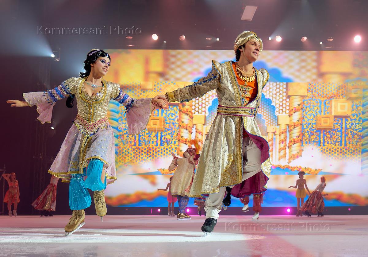 Ледовый спектакль "Аладдин и повелитель огня" Ледового театра Елены Бережной в спорткомплексе (СК) "Юбилейный". Фигуристы Тимур Воситов и Александра Кошевая во время спектакля.